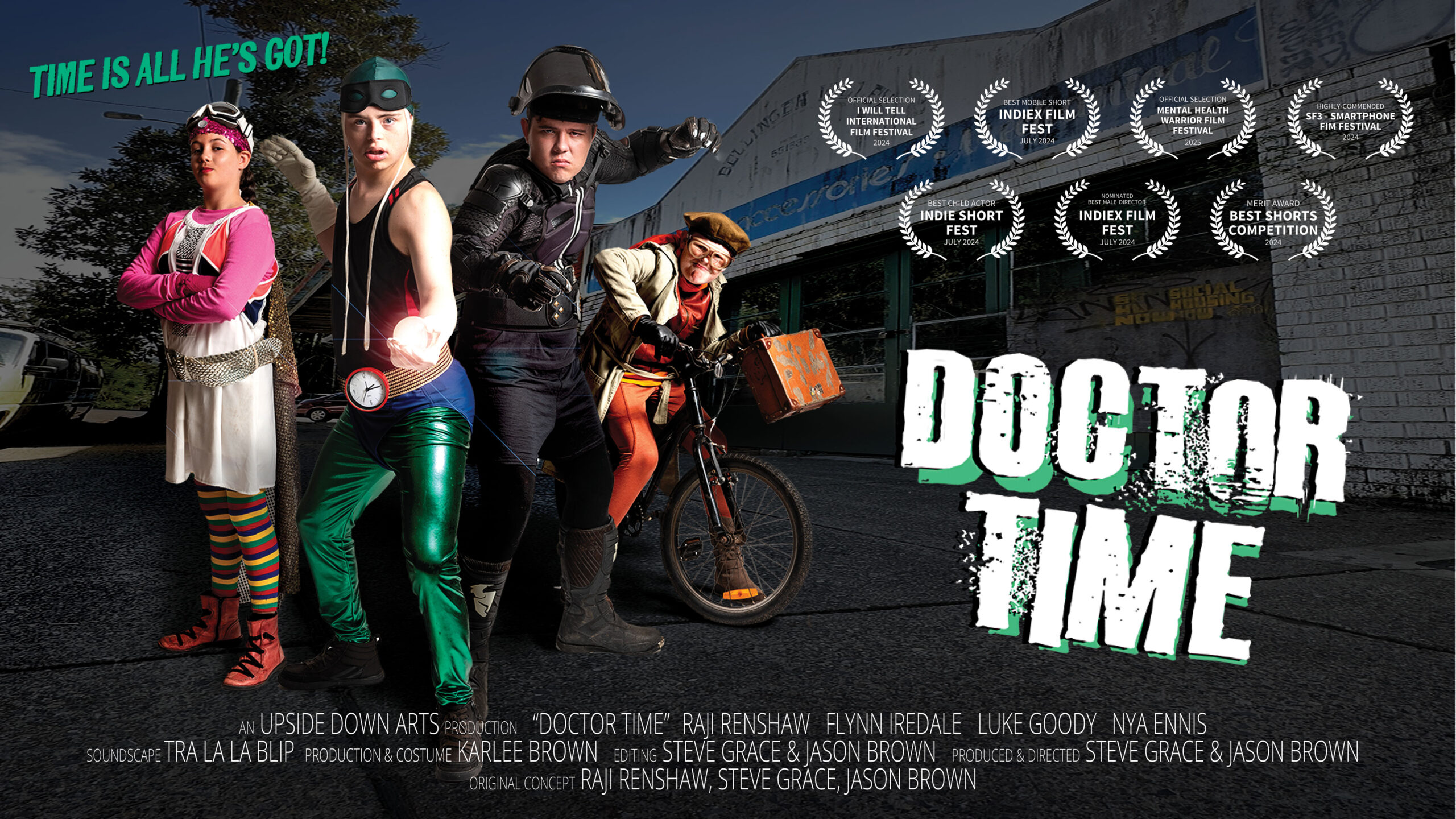 Doctor Time is a short comedy action filmed in the small Australian town of Bellingen, shot entirely on iPhone by a resourceful and creative team embracing imagination and ingenuity at every stage of production. The story of a young teen who realises he has super hero powers, the concept and script was driven by Raji Renshaw, a highly imaginative 15 year old actor with Down syndrome. Raji was mentored by Stephen Grace and Jason Brown who collaborated as directors and producers. The premise of Doctor Time as a film, and a creative project, was to give a young person who is typically underrepresented or often not given a go, his time in the lime light. This was a chance for the boy with Down syndrome to be the super hero.