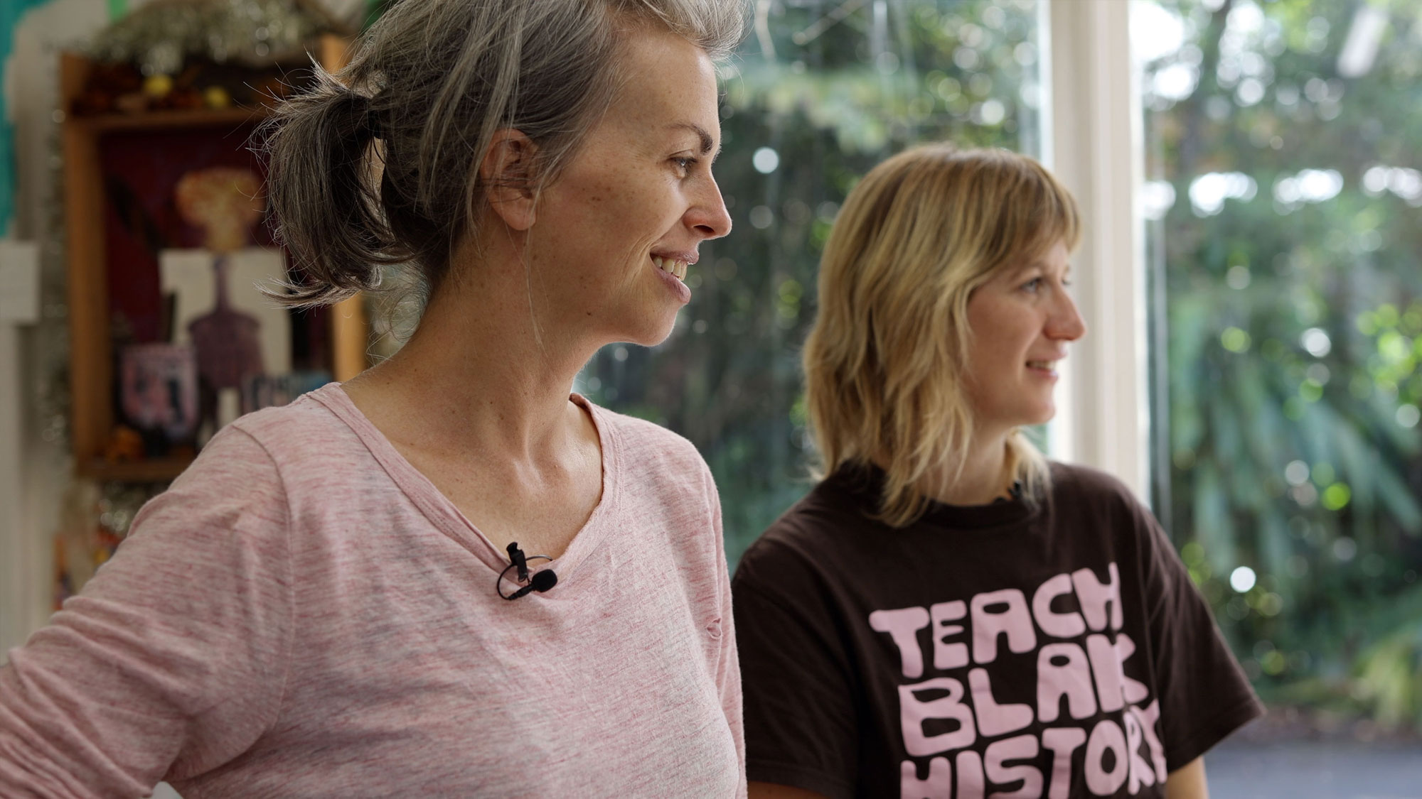 Karlee Rawkins and Ashleigh Frost, Curator at YAM, discuss the story and processes behind Rawkins’ exhibition ‘Never Neverland’. This collection of work explores the motifs from Peter Pan to represent Rawkins experience of parenting and ideas around seeing and experiencing differently. Rawkins collaborates with her teenage son Raji, who has Down syndrome. See paintings and footage from Rawkins studio at Never Never Creek on Gumbaynggir Country.